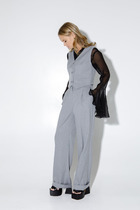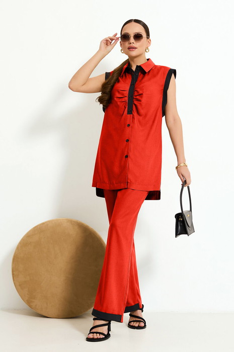 Дизайнерский комплект, состоящий из брюк и блузы без рукава. Удлиненная блуза прямого силуэта с боковыми разрезами. Застежка центральная с петлями и пуговицами. Воротник рубашечный, по борту отрезная планка из отделочной ткани и сборкой. Перед с планками-рукавами из отделочной ткани и боковой детали чтобы не было видно белья. Прямые брюки с отрезным поясом, с резинкой по бокам. Карман с боковой частью и планкой из отделочной ткани. В низу передней части брюк манжета из отделочной ткани. Застежка обработана по классической технологии (гульфик с молнией и пуговица на поясе). Модель прекрасно подойдет для офиса и вечерних прогулок.