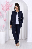 Костюм   интересного  кроя  с фигурными боковыми  выемками зрительно   вытягивает силуэт. Блузон полуприлегающего силуэта   с V-образным вырезом и воротником – стойкой. Центральная застежка на стильные металлические пуговицы и пробивные петли с  глазком. Клапаны и паты с декоративными пуговицами дополняют образ. Спинка без шва. Рукав - крыло фиксируется на пату. Юбка   с отрезным поясом, по бокам на резинке, застежка на потайную молнию в среднем шве .На передней части юбки боковые карманы и вертикальные рельефы ,боковая часть с подрезом и 2-мя складками. Костюм без подкладки.