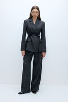 Жакет с воротником пиджачного типа и центральной застёжкой на петли и пуговицы. Перед с карманами с клапанами в нижней части и листочкой в верхней. Спинка со средним швом и двумя рельефами. Рукава втачные с пуговицами по низу. Жакет на подкладке. По локтевому шву рукава и боковому шву жакета идёт декоративный кант. Листочка со съёмной деталью в цвет канта.