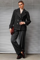 Жакет с фигурным вырезом горловины, фигурным краем борта и застёжкой на петли и пуговицы. Перед с накладными карманами в нижней части. Спинка со средним швом и талиевыми вытачками. Рукава втачные. По горловине, краю борта и низу изделия идёт декоративный кант. Изделие на подкладке.