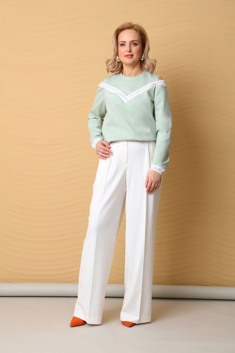 Комплект 2ка, состоящий из джемпера и брюк. Джемпер свободного объёма, оригинального кроя, с имитацией топа и открытыми плечами. Горловина круглая, по спинке застежка на петлю и пуговицу Отделка горловины джемпера и манжеты выполнены из довязов в контрастном цвете. Брюки широкого объема, прямого силуэта. На передних половинках брюк заутюжены стрелки, переходящие в складки по линии талии. На задних половинках также заутюжены стрелки. В боковых швах расположены карманы. Застежка-гульфик. Пояс отрезной, притачной. В задней части пояса вставлена эластичная тесьма (резинка). На пояс настрочены шлевки. Выступающая часть пояса застегивается на петлю и крючок. Рост модели 170, размер 48. СОВЕТ ОТ СТИЛИСТА: из обуви отлично подойдут лодочки. Для образа "выходного дня" сделайте выбор в пользу кроссовок или кед.