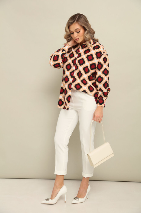 Комплект 2ка, состоящий из рубашки и брюк. Рубашка женская большого объема, прямого силуэта. На детали спинки расположена двойная кокетка, переходящая на деталь полочки. Под кокеткой на спинке встречная складка. Воротник рубашечный отложной на стойке. Застежка планка центральная на прорезные петли и пуговицы. Линия плеча спущенная, рукав рубашечный, длинный. В нижней части рукава заложены складки, заканчивается манжетой с двумя прорезными петлями и пуговицами. Низ блузки разноуровневый: спереди короче, сзади длиннее. Зауженные брюки с подворотами по низу. Пояс на эластичной тесьме с кулисой и втянутым шнурком. Вход в карман фигурный, наклонный к боковому шву.