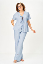 Комплект 2ка состоит из рубашки и брюк. Брюки из джинсовой ткани свободного объёма от бедра с застёжкой на молнию и пуговицу. По переду и сзади расположены карманы. Рубашка женская большого объема, прямого силуэта. На детали спинки расположена двойная кокетка, переходящая на деталь полочки. Под кокеткой на спинке встречная складка. Воротник рубашечный отложной на стойке. Застежка планка центральная на прорезные петли и пуговицы. Линия плеча спущенная, рукав рубашечный, длинный. В нижней части рукава заложены складки, заканчивается манжетой с двумя прорезными петлями и пуговицами. Низ блузки разноуровневый: спереди короче, сзади длиннее.