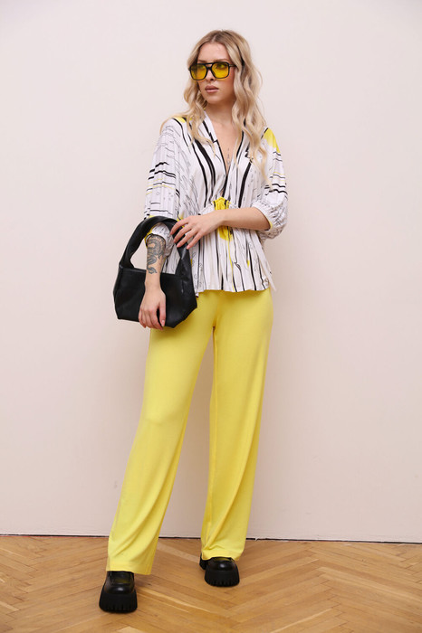 Костюм 2ка, состоящий из трикотажной блузки и брюк. Блузка свободного силуэта с V-образным вырезом горловины. Рукав блузки цельнокроеный. Ниже линии груди вставлена эластичная резинка. Брюки прямого силуэта с резинкой по талии.