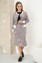 Комплект, состоящий из куртки и платья. Платье прямого силуэта , свободного объема, со спущенной линией плеча. По бокам платья расположены карманы.По низу переда и спинки разрезы. Также, низ платья по бокам можно регулировать по длине за счет шнуровки и регуляторов. На перед платья настрочены молнии, на которые застегивается съемная куртка. Куртка длинной до талии .По переду расположены клапаны, воротник-стойка. Куртка съемная, ее можно надеть отдельно от платья. Рост модели 170, размер 48.