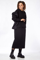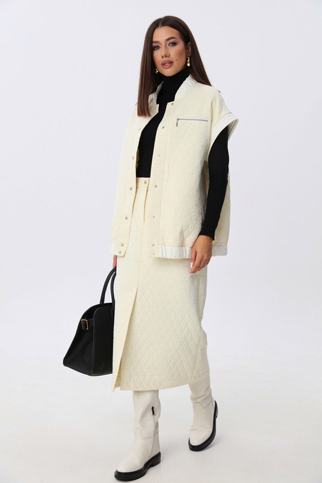 Костюм 2ка, состоящий из жилета и юбки. Объёмный жилет из стёганой ткани на подкладке с центральной застёжкой на кнопки. По переду жилета имитация нагрудного кармана с молнией, а по бокам полочки расположены функциональные карманы. По горловине и низу жилета детали из отделочной трикотажной ткани. Низ жилета на резинке. Юбка-карандаш длиной ниже колена с шлицей по переду. Застёжка на молнию с кнопкой. На пояс юбки настрочены шлевки. Рост фотомодели 175 см. Размер у фотомодели – 44. Длина юбки в 44 размере 83 см, длина жилета по спинке 68 см.