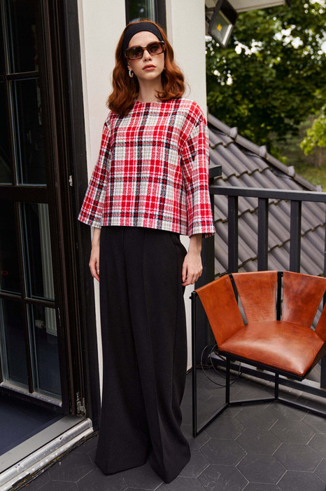 Костюм состоит из топа и брюк. Топ выполнен из текстильной ткани дизайн клетка, на трикотажной подкладке. Линия плеча спущена, рукав укороченный 3/4. По переду округлый вырез горловины. По спинке застёжка на петли и пуговицы. Брюки на притачном поясе, на резинке по задней половинке брюк. В боковых швах прорезные карманы, по центру на передних половинках брюк защипы.