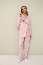 Комплект состоит из жакета и брюк. Жакет свободного кроя, выполнен из жаккардовой ткани с легким мерцанием на подкладке, что дает максимум комфорта в носке. Рукав длинный, линия плеча спущена, округлый вырез горловины, застежка центральная на петли пуговицы, по переду карман листочка. Воротник и манжет съемный.