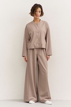 Костюм состоит из жакета и брюк. Жакет прямого силуэта, линия плеча спущена, рукав короткий, по низу рукава отложные манжеты с окантовкой в красном цвете. Округлый вырез горловины. Застежка глубокая, двубортная на петлю и пуговицу, низ борта округлой формы. Брюки на притачном поясе, по переду складки, застежка на молнию. В боковых швах прорезные карманы, по низу брюк отложная манжета.