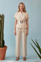 Костюм выглядит современно и интеллектуально: минимализм форм сочетается с продуманной конструкцией. Натуральный оттенок и текстура ткани делают модель универсальной — она уместна как в дневных, так и в более формальных образах.