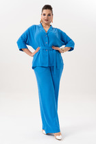 Джемпер из трикотажного полотна, прямого, слегка расширенного силуэта, со спущенной линией плеча. По горловине цельнокроеная стойка. На стойке и плече две складки. Рукав длинный с манжетой. По низу джемпера пояс.