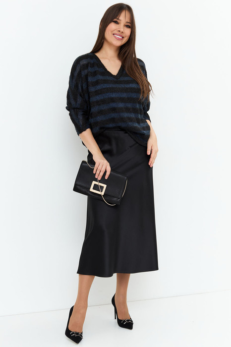 Элегантный комплект из блузы  топа и юбки. Блуза свободного кроя с  V-образным вырезом  и цельнокроеным рукавом. Выполнена из вязанного полотна. Юбка А-образного силуэта с эластичной тесьмой по талии.  Топ на тонких  бретелях с регуляцией. Длина блузы от плечевого шва 63 см. Длина рукава 53 см.  Длина юбки 80 см.