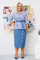 Элегантный комплект из жакета и юбки. Жакет полуприлегающего силуэта, на подкладке, с центральной застежкой на пришивные пуговицы. Рукав втачной. Жакет дополнен боковыми накладными карманами. Юбка классического кроя, заднее полотнище со средним швом, застегивается на потайную молнию. Боковой шов дополнен разрезом. Комплект выполнен из полотна "рогожка". Длина жакета от плечевого шва 61см. Длина рукава 60см. Длина юбки 67см.