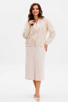 Элегантный комплект из блузы и юбки в бежевых тонах. Блуза . свободного кроя со спущенным рукавом. Выполнена из фактурного трикотажного полотна средней плотности. Горловина округлой формы. По груди отделка декоративной тесьмой и бусинами. По спинке застежка на металлическую молнию. Юбка прямого классического кроя на подкладке. По спинке застежка на потайную молнию. Длина блузы от плечевого шва 61см. Длина рукава 56см. Длина юбки 74см.