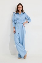 Стильный и элегантный комплект из жакета и брюк. Жакет прямого кроя, на подкладке, с центральной застежкой на пришивные пуговицы. Выполнен из джинсовой ткани в сочетании с рогожкой. Рукав втачной, снизу дополнен притачной манжетой с застежкой на пришивную пуговицу. Воротник отложной. По талии скрытая кулиска с фиксаторами. Брюки свободного кроя, слегка заужены книзу. Посадка средняя. Пояс притачной, дополнен эластичной тесьмой. Брюки дополнены удобными боковыми карманами. Застежка гульфик на молнию и металлическую пуговицу. Брюки выполнены из джинсовой ткани средней плотности. Длина жакета от плечевого шва 75см. Длина рукава 60см. Длина брюк по боковому шву 98 см.