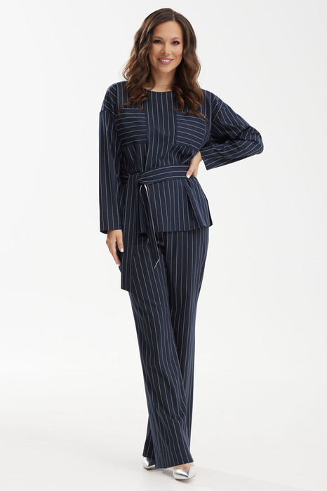 Элегантный комплект из блузы и брюк. Выполнен из комфортной костюмной ткани. Блуза полуприлегающего силуэта со спущенной линией плеча, горловина округлой формы. По линии талии переда и спинки параллельно защипы в виде складки, что подчеркивает талию. В комплект входит пояс из основной ткани. По переду настрочены накладные карманы, по спинке в средний шов вставлена декоративная металлическая молния. Брюки классического прямого кроя с притачным поясом, дополненным эластичной тесьмой. Дополнены удобными боковыми карманами. Застежка гульфик на молнию и пришивную пуговицу. Длина блузы от плечевого шва 67см. Длина рукава от горловины 57 см. Длина брюк по боковому шву 107 см.