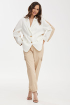 Стильный комплект из жакета-бомбера и брюк. Верх комплекта выполнен спереди как классический жакет, а по спинке как стильный бомбер. Оригинальное слияние стилей придает неповторимость данному комплекту. Перед выполнен из костюмной ткани, спинка из плащевки. Жакет на подкладке, центральная застежка на пришивные пуговицы. Рукав втачной, слегка спущен. Воротник отложной. Дополнен удобными карманами с клапанами. Спинка по низу дополнена эластичной тесьмой. Брюки карго свободного прямого кроя с притачной талией , дополненной эластичной тесьмой. По бокам расположены удобные карманы. По низу брюки дополнены эластичной тесьмой. Длина жакета от плечевого шва 75см. Длина рукава 60 см. Длина брюк по боковому шву 98см.
