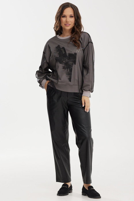 Стильный коммплект из джемпера и брюк. Джемпер свободного кроя Горловина округлой формы. Рукав слегка спущен. Джемпер дополнен оригинальной термо аппликацией. Поверх джемпера наложена прозрачная текстильная сетка , которая закреплена по горловине и рукаву. Брюки свободного кроя, слегка заужены к низу, с притачным поясом, дополненным эластичной тесьмой. Посадка средняя. Брюки дополнены удобными боковыми карманами. Застежка на металлические кнопки и молнию. Выполнены из эко кожи премиум класса с приятной к телу изнаночной стороной. Длина джемпера от плечевого шва 64 см. Длина рукава 60 см. Длина брюк по боковому шву 100 см.