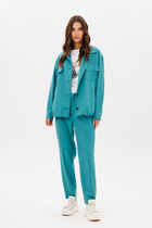 Стильный костюм из джемпера и брюк. Выполнен из фактурного трикотажного полотна (штрукс) в комбинации с красивой мягкой плащевой тканью. Джемпер свободного кроя с застежкой по спинке на кнопки. Рукав слегка спущен. По низу джемпер дополнен красивой сборкой на эластичную тесьму и завязывается в красивый бант. Брюки прямого свободного кроя, с притачным поясом, дополненным эластичной тесьмой. Посадка средняя. По бокам брюки дополнены удобными карманами. Длина спинки 69см. Длина брюк по боковому шву 104см.