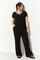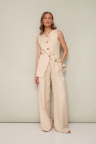 Комплект женский, состоящий из жилета и юбки. Жилетка со средним швом по спинке, переходящим в разрез. Завязывается сзади на пояс. По переду вытачки, переходящие в рельеф. V-образная горловина, фигурный низ, карманы с листочкой, функциональные, застежка на 4 пуговицы. Юбка А-силуэта со средним швом по спинке и переду. В боковых обработаны карманы, пояс на резинке, застежка на молнию и пуговицы.
