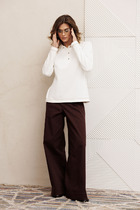Костюм льняной 2-х предметный от MALI, состоящий из жилета и брюк. Жилет прямого силуэта без подклажки, на центральной двубортной застежке на петли и пуговицы. Перед с талиевыми вытачками и прорезными карманами "в рамку" с клапанами. Спинка со средним швом, внизу которого шлица. Воротник стояче-отложной с лацканами. Жилет удлиненный, в комплекте идет съемный пояс из основной ткани. Брюки прямые, Брюки прямые. С карманом с отрезным бочком. Пояс на резинке и декоративным гульфиком без кулисы.