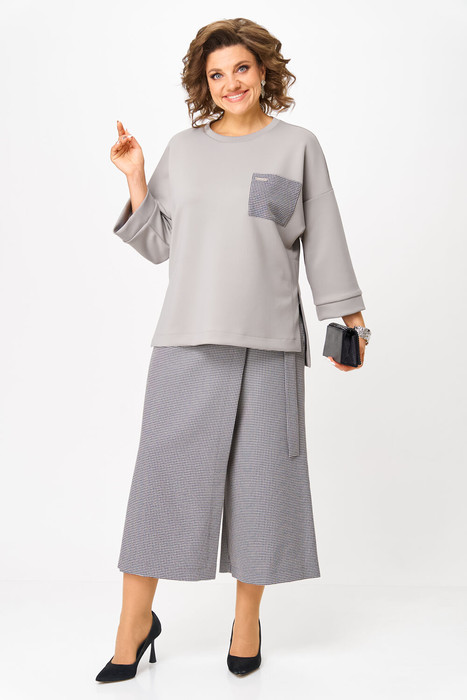 Стильный женский костюм для осени. Идеальное сочетание утонченного стиля и удобства — этот костюм создан для современных женщин, ценящих элегантность в повседневной жизни. Комплект состоит из брюк-кюлотов с элегантным запахом и трикотажного джемпера. Брюки-кюлоты выполнены из брючной ткани в мелкую клетку. Изделие свободной посадки с укороченными широкими штанинами, чуть выше щиколотки. Притачной пояс с резинкой поверху, запах фиксируется поясом с застежкой фастекс. Джемпер имеет свободный крой с карманом на передней части, гармонирующим с цветом брюк, рукав спущен, по бокам разрезы, благодаря чему его с легкостью можно носить как навыпуск, так и заправленным. Костюм женский может стать основой вашего делового или офисного образа, придавая ему нотки классики и строгости. Эта одежда подходит не только для рабочих встреч в офисе, но и будет уместна в повседневной жизни, благодаря своей универсальности и комфорту. Брючный комплект можно комбинировать с различными вариантами обуви разных стилей — от строгих туфель до более повседневных ботинок. Длина джемпера по спинке 68 +/-1 см, длина рукава 58 +/-1 см. Длина брюк по боковому шву 92 см, шаговому — 60 см. Изделие подойдет на рост 170 см.