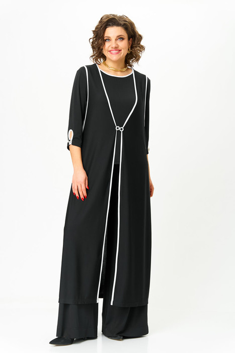 Нарядный и эффектный женский брючный костюм, состоящий из трех предметов: длинной жилетки- безрукавки, брюк-палаццо, и топа с рукавом 3/4. Жилет длинный, с разрезами по боковым швам, застежка по переду на две пуговицы. Брюки палаццо, прямые, расширенные к низу, на резинке, по бокам карманы. Топ средней длины, рукав три четвери, низ рукава оформлен декоративной «каплей». Края жилета, горловина топа, и низ рукава отделан белой окантовкой. Костюм станет незаменим для любых торжественных мероприятий, также благодаря свой универсальности смело можно создавать образы с другими предметами вашего гардероба. Длина жилета по спинке 135 см(+-1см) , длина топа по спинке 56 см(+-1см), длина рукава от горловины 56 см(+-1см). Длина брюк по боковому шву 112см(+-1см), по шаговому шву 82 см(+-1см). Изделие подойдет на рост 170см.