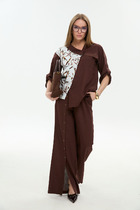 Летний комплект, состоит из майки и юбки. Майка выполнена из вискозы и декорирована текстильной, вискозной тканью с современным принтом «тай-дай». Горловина платья округлой формы, обработана бейкой из основной ткани, на полочке выполнены подрезы с вставками из текстильной, вискозной ткани в виде воланов, что является хитом этого сезона! Рукав втачной, укороченный, спинка из вискозы, на полочке декоративный, съемный элемент. Юбка расклешенного силуэта, выполнена из легкой текстильно-вискозной ткани, на хлопковой подкладке. Верх обработан обтачкой, по переднему полотнищу обработана встречная складка, на заднем полотнище средний шов с потайной молнией. По линии талии юбки настрочены шлевки, также прилагается пояс из основной ткани с пряжкой. Многофункциональный, стильный комплект, который можно сочетать с другими вещами вашего гардероба, то, что необходимо вам для вашего летнего гардероба!