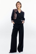 Спортивный костюм выполнен из принтованного и однотонного велюра. По переду выполнена застежка на тесьму-молнию, горловина обработана воротником-стойкой. Также на полочке выполнен горизонтальный подрез, нижняя часть из однотонного велюра на ней выполнены прорезные карманы с молнией. Спинка выполнена из принтованного велюра, низ кофты на планке из однотонного велюра. Рукав втачной, выполнен из однотонного и принтованного велюра, низ рукава на манжете. Брюки выполнены из однотонного велюра, по боковым вставка из принтованного велюра, в боковых швах карманы. Верхний срез на резинке, по низу брюки на манжете. Стильный, современный костюм, выполнен из стрейчевой ткани, трендовая новинка этого сезона!