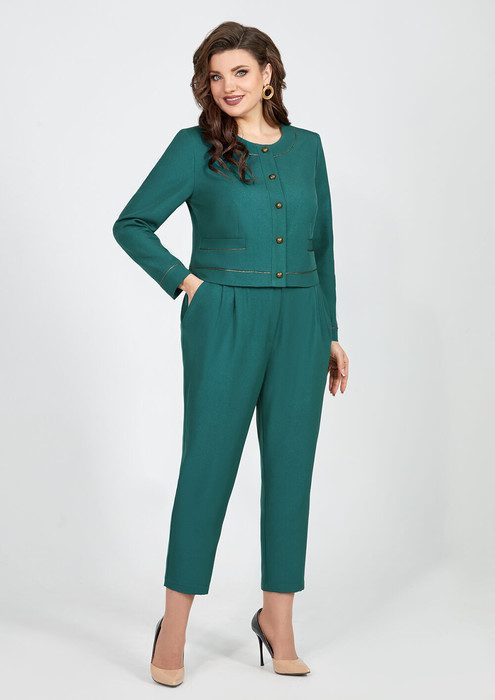 Стильный, женский костюм полу-прилегающего силуэта, выполнен из текстиля, на подкладке. Костюм состоит из жакета и брюк. Жакет на подкладке, с застежкой на планку с пуговицами, горловина округлой формы, с обтачкой декорированной кантом. На полочке обработаны прорезные карманы с листочкой, по низу жакет с планкой, все декорировано кантом. Спинка со средним швом и вытачками, рукав втачной, оптимальной длины, по низу на манжете с кантом. Брюки заужены к низу, верхний срез обработан притачным поясом, застежка по переду на молнию и пуговицу. По переду брюк обработаны складки, в боковых швах карманы. Эффектный костюм классического покроя прекрасный выбор для вашего гардероба.