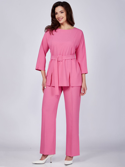 Костюм состоит из блузки и брюк. Блузка с рельефами выходящими из плеча и декоративными разрезами по низу. Спинка с застежкой на петли и пуговицы. Рукав цельнокроеный с разрезами по по низу. Брюки с застежкой в боковом шве и разрезами по низу. Изделие дополняет пояс с пряжкой. Длина блузки 70 см, длина рукава от горловины 57 см. Длина брюк 104 см