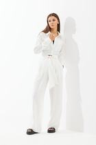 Комплект женский двухпредметный.  Блузка - прямого силуэта с V-образным вырезом горловины. По спинке застежка на 3-петли и пуговицы. В боковых швах разрезы. Рукав втачной со складкой по низу с манжетой. Брюки классического покроя, прямые от бедра. В боковых швах карманы с отрезными бочками. Пояс отрезной со шлевками. Застежка на молнию и петлю с пуговицей. Изделие дополнено съемным поясом из основной ткани на пряжке. Длина блузки 69 см, длина рукава 52 см, длина брюк 106 см. Украшение в комплект не входит.