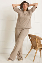 Комплект двухпредметный состоит из жакета и брюк. Жакет на подкладке с центральной застежкой на 2 петли и пуговицы с воротником пиджачного типа. По переду функциональными карманами с клапаном. Спинка с рельефом выходящим из проймы и средним швом. Рукав втачной с декоративным швом по середине рукава переходящим в шлицу. Шлица декорирована 5-ю пуговицами. Брюки прямые от бедра с боковыми карманами. Пояс на резинке по спинке. Костюм двойка отлично подойдет для офиса, для праздника, на каждый день для прогулок.