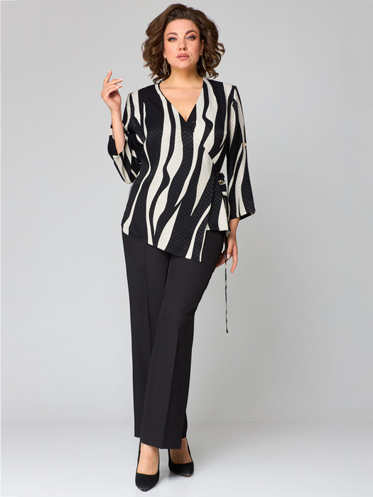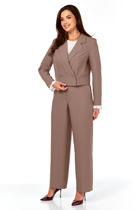 Комплект женский 2-ух предметный состоящий из туники и брюк.Туника полуприлегающего силуэта на запах из вискозной ткани. V-образный вырез горловины, красиво подчеркивает линию декольте. По переду застрочена нагрудная вытачка. Спина цельнокроеная. Рукав втачной одношовный с патой, с помощью которой можно регулировать длину рукава. Брюки прямого силуэта на притачном поясе, с посадкой на талии, с застежкой на тесьму- молнию и 1 петлю и 1 пуговицу, с боковыми наклонными карманами на передних половинках брюк . По передним и задним половинкам брюк заутюжены стрелки. Для лучшего прилегания брюк в области талии в поясе со стороны спинки вставлена резинка.