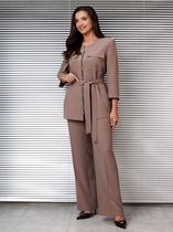 Комплект женский2-ух предметный, состоящий из блузки и юбки. Блузка прямого силуэта с фигурным низом из двух разных фактур тканей. Воротник отложной на стойке. По переду нагрудные вытачки и потайная застёжка на петли пуговицы перходящаа в складку. По правой верхнй части переда пришивное украшение . Рукав втачной длинный со сборкой по низу, на манжете. Манжет с застёжкой на петлю и одну пуговицу. Юбка прямого силуэта, на подкладке с притачным поясом, по бокам резинка. Застёжка по спинке на молнию, в среднем шве юбки разрез. Длина блузки 61см, длина рукава 59см, длина юбки 71см.