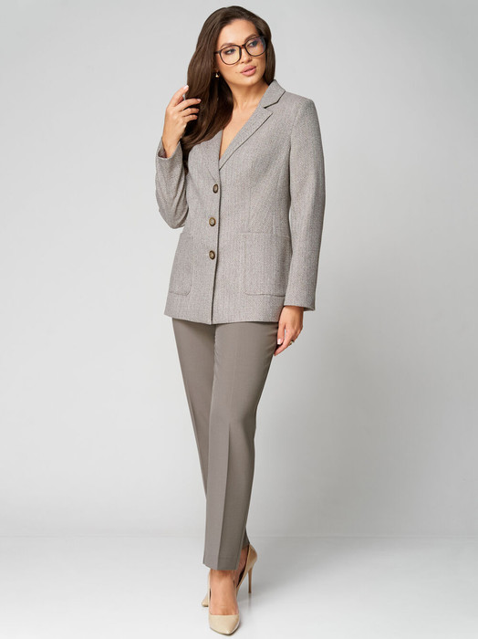 Комплект женский , двухпредметный жакет и брюки. Жакет на подкладке классического стиля. Воротник отложной с лацканами. По переду настрочены накладные карманы. Застежка однобортная на 3 пуговицы и петли. Длина жакета по спинке - 70 см. Спинка со средним швом и двумя шлицами. По шлицам пришиты пот3 декоративные пуговицы. Рукав втачной, двухшовный. Длина рукава – 60 см. Брюки прямые, заужены к низу. Длина брюк по боковому шву без пояса - 102см. Брюки на поясе, по бокам резинка и косые карманы