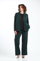 Комплект женский состоит из жакета и брюк, выполненных из костюмной ткани. Жакет прямого силуэта,  двубортная застежка на 2 петли и пуговицы. По переду заниженные карманы в рамку. Рукав втачной, двух шовный. По спинке центральный шов, заканчивающийся шлицей. Воротник пиджачного типа. Жакет на подкладке. Брюки прямого силуэта, пояс частично на резинке и шнурке. Карманы в боковых швах.