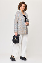 Костюм женский, состоит из блузы и брюк. Блуза прямого силуэта. Воротник стоячий отложной, застежка центрально-бортовая потайная, на петли-пуговицы. В подрезах полочек , спинки и рукавх вставки: декоративная кружевная тесьма из хлопка. Рукав внизу на резинке, в боковых швах блузы - разрезы. Брюки на резинке, свободные, прямые, с боковыми карманами. Подкладка вискозная - с шортиками.