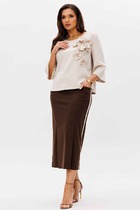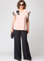 Костюм женский, состоит из блузы и брюк. Рукав у блузы - реглан, со сбокой по окату. Рукав расширенный до линии локтя. По переду и спинке блузы - притачная планка с резинкой. Низ блузы с притачным поясом и резинкой. Брюки на резинке, свободные, прямые, с карманами в боковых швах.