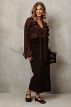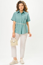 Костюм женский, состоящий из блузы и брюк. Блуза прямого силуэта, с разрезами по бокам. Ассиметричный низ: спинка длиннее переда. Рукав цельнокроеный, заканчивается притачной манжетой. Горловина V-образная с притачной планкой по линии переда, спинки и рукава. Головина на завязке. Дополнением служит пояс. Брюки по силуэту с легким клешем от колена, по передним половинкам по центру застрочен защип. Карманы боковые накладные. Брюки с застежкой на молнию. Притачной пояс застегивается на петлю-пуговицу и с резинками по бокам. Модель без подкладки.