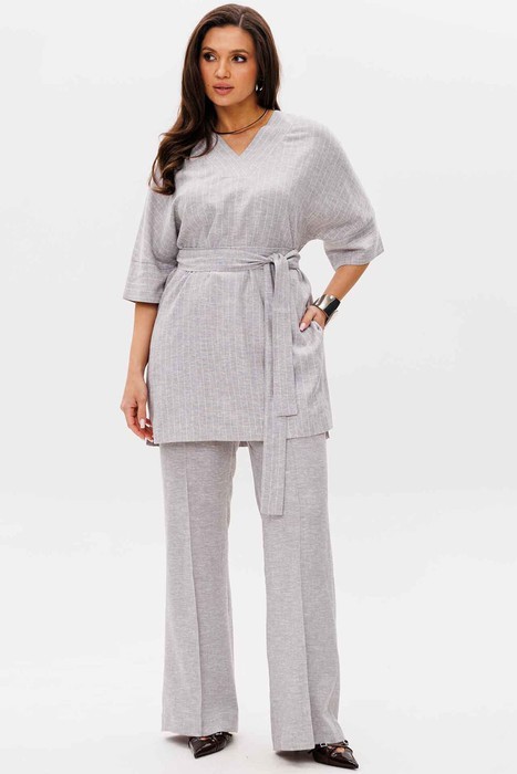 Костюм женский, состоящий из блузы и брюк. Блуза прямого силуэта, с разрезами по бокам. Рукав цельнокроеный, заканчивается притачной манжетой. Горловина V-образная с притачной планкой по линии переда, спинки и рукава. Головина на завязке. Дополнением служит пояс. Брюки по силуэту с легким клешем от колена, по передним половинкам по центру застрочен защип. Карманы боковые накладные. Брюки с застежкой на молнию. Притачной пояс застегивается на петлю-пуговицу и с резинками по бокам. Модель без подкладки.