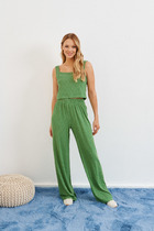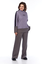 Костюм женский состоит из блузы и брюк. Блуза свободная, А-силуэта, рукав втачной. Спинка со средним швом, заканчивающимся на воздушную петлю-пуговицу. По низу изделия и низу рукава декоративные детали из пайеток. Брюки палаццо, на притачном поясе с резинкой и тесьмой. У брюк - боковые карманы.