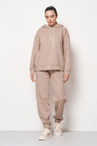 Костюм женский, состоящий из жилета и брюк. Жилет полуприлегающего силуэта, без подкладки. Плечо спущенное.Вырез V - образный, с воротником стойкой. по переду иммитация карманов с клапаном. Центральная застежка на пришивные кнопки. Спинка со средним швом и вытачками. Брюки прямого силуэта, слегка зауженные к низу. Пояс частично на резинке (по бокам), с шлевками для ремня. Застежка на гульфик с молнией и внутренним крючком. По бокам боковые карманы с косым входом, сзади декоративные прорезные карманы «в рамку». Материал костюма костюмный, средней плотности, с гладкой фактурой. Без подкладки. Дополняет модель широкий пояс.