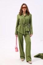 Женский брючный костюм, состоящий из жакета и брюк. Жакет полуприлегающего силуэта, двубортный, с застежкой на две пуговицы. Воротник английский. Рукав втачной, из кружевной ткани, заканчивается манжетой на пуговице. По бокам рельефные швы, формирующие силуэт. На уровне груди предусмотрены нагрудные вытачки. Брюки прямого силуэта, слегка зауженные к низу. Пояс частично на резинке (по бокам), с шлевками для ремня. Застежка на гульфик с молнией и внутренним крючком. По бокам боковые карманы с косым входом. Материал костюма костюмный, средней плотности, с гладкой фактурой. Без подкладки. Дополняет модель широкий пояс.