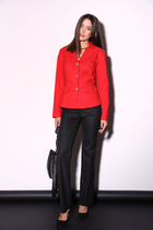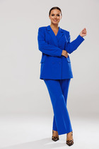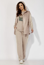 Комплект женский состоит из жакета и юбки. Жакет полуприлегающего силуэта удлинённый, с центральной застёжкой на две прорезные петли и пуговицы. Перёд жакета с нагрудными вытачками, рельефами от проймы до низа и прорезными карманами с одним декоративным клапаном. Лацканы классической формы. Спинка со средним швом, рельефами от проймы до низа, которые заканчиваются шлицами с разрезом. Рукава втачные двух шовные. Жакет на подкладке. Юбка, слегка зауженная к низу на притачном поясе. Застёжка молния с гульфиком и откоском расположена в центральном шве передней части юбки. По спинке талевые вытачки. В пояс юбки по спинке продета тесьма резинка. Юбка на подкладке.