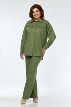 Костюм женский. Состоит из жакета и брюк. Ткань костюмная. Жакет однобортный, прямого силуэта с закругленными бортами, застегивавется на 2 петли и пуговицы. Карманы в рамку с клапаном. Спинка со средним швом, заканчивающимся шлицей.Рукав втачной двухшовный. Задний шов рукава с имитацией шлицы и 4мя отделочными пуговицами. Воротник стоячиц отложной. На левой полочке, в области груди, имитация кармана с листочкой. Брюки на резинке и шнурке, прямые, с боковыми карманами.