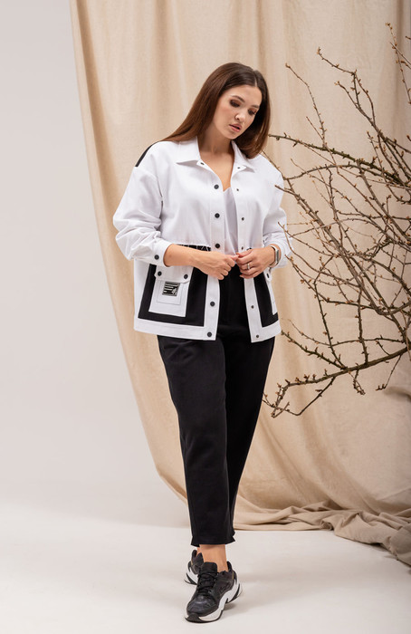 Куртка, комбинированная из двух различных по цвету тканей, со спущенными плечами застёгивается на семь кнопок. По переду накладные карманы с фигурными клапанами на застёжке. Воротник отложной. Рукава одно шовные втачные на манжете. На  спинке декоративное пришивное украшение.