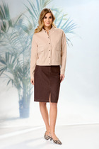 Костюм женский полуприлегающего силуэта состоит из жакета и юбки. Жакет на подкладке. По переду нагрудные вытачки, накладные фигурные карманы, застёжка на тесьму молния. Спинка с талевыми вытачками и центральным швом. По горловине и низу жакета притачная планка. Горловина круглая. Рукава двухшовные втачные на широкой манжете. Юбка, слегка зауженная к низу, без пояса, на обтачке. По переду талевые вытачки. По спинке талевые вытачки. Застёжка потайная тесьма молния расположена в центральном шве спинки. Юбка на подкладке
