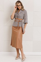 Стильный и элегантный костюм, состоящий из жакета и юбки. Жакет прилегающего силуэта выполнен по переду и спинке с рельефами, выходящими из проймы. На полочке обработаны карманы в рамку с клапаном. Спинка со средним швом. Рукав втачной двухшовный. Воротник пиджачного типа. Застежка центральная на петли с пуговицами. Юбка прямая, зауженная к низу, на притачном поясе с резинкой. Застежка на тесьму-молнию в среднем шве, который переходит в шлицу. Жакет и юбка на подкладке