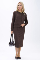Двухпредметный комплект, который состоит из жакета и брюк. Жакет полуприлегающего силуэта с ассиметричной полочкой, на которой выполнен карман в рамку. Рукав втачной, двухшовный. Спинка со средним швом и талиевыми вытачками. Воротник пиджачной формы. Жакет на подкладке. Брюки прямые, по низу с манжетой, сверху на притачном поясе-кокетке, по бокам с карманами. Застежка на тесьму-молнию в среднем шве.